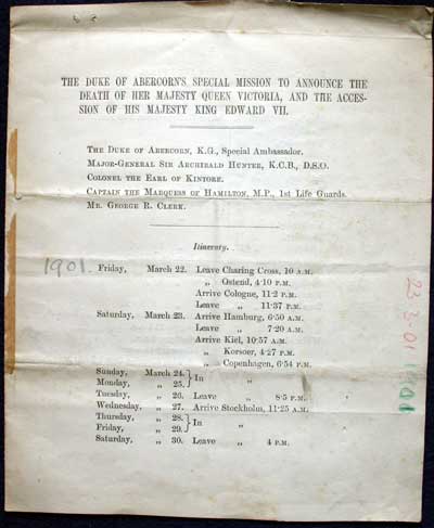 Archive of General Sir Archibald Hunter GCB GCVO DSO TD LLD at the King's Own Royal Regiment Museum, Lancaster. The Duke of Abercon’s Special Mission to Announce the death of Her Majesty Queen Victoria, and the Accession of His Majesty King Edward VII. (Mar 1901) Including the Duke of Abercorn, Special Ambassador; Major General Sir Archibald Hunter; Colonel the Earl of Kintore; Captain The Marques of Hamilton, MP, 1st Life Guards; Mr George R Clerk. The itinerary includes Ostend, Cologne, Hamburg, Kiel, Korsoer, Copenhagen, Stockholm, Abo, Rilhimaki, St. Petersburg, Berlin, Dresden and return to London. Accession Number: KO2686/132