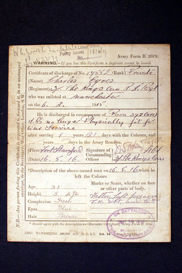 Lancaster Regiment. Enlisted on 6 Feb 1915 and discharged 16 May
