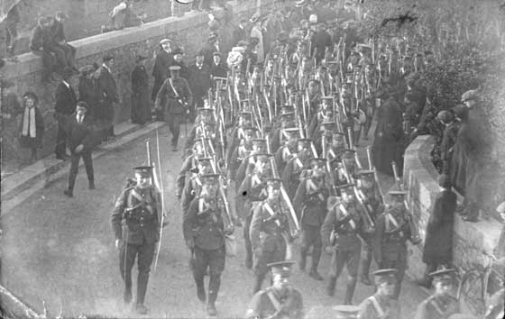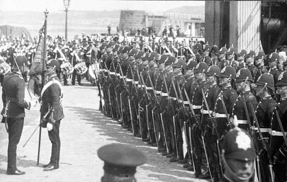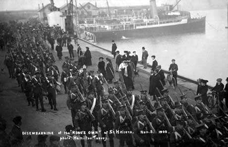 Regiment arriving at Jersey, Channel Islands, in 1908. The photo