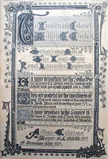 Photo Gallery South African War (Boer War) 1899 - 1902 2nd Battalion Departs Lichfield for South Africa, Dec 1899 The 2nd Battalion of the King's Own Royal Lancaster Regiment, based at Whittington Barracks, Lichfield, were mobilised for service in the South African War as part of the Lancashire Brigade. On 1st December 1899 the Mayor and Corporation of Lichfield presented an address, tobacco and cigarettes to the Battalion prior to their departure. The 2nd Battalion sailed for South African on the SS Dilwara embarking at Southampton on 2nd December 1899. The Battalion disembarked at Durban, Natal on 30th December 1899.