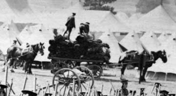 Close up view of baggage wagon at the rear of the marching troops.