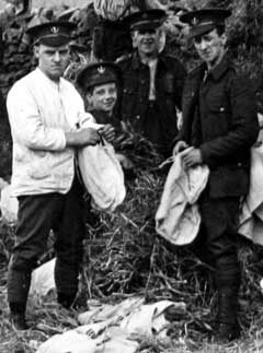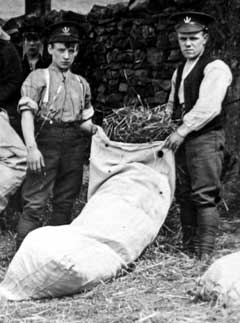 Soldiers of the Loyal North Lancashire Regiment packing straw at