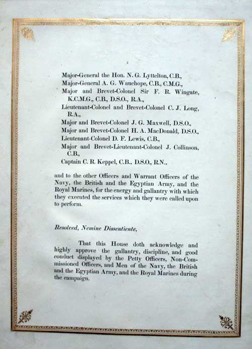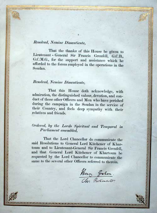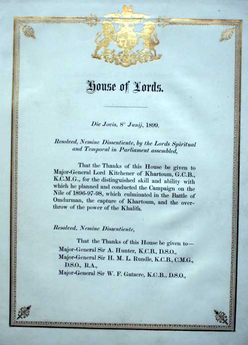 Archive of General Sir Archibald Hunter GCB GCVO DSO TD LLD at the King's Own Royal Regiment Museum, Lancaster. Vote of Thanks from Both Houses of Parliament Vote of