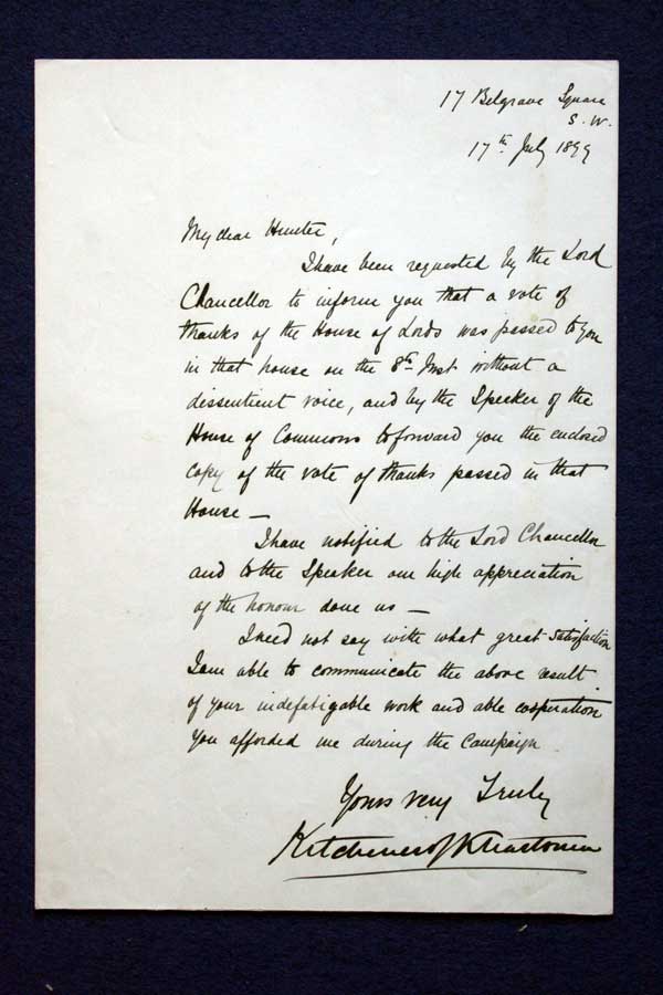 Archive of General Sir Archibald Hunter GCB GCVO DSO TD LLD at the King's Own Royal Regiment Museum, Lancaster. Vote of Thanks from Both Houses of Parliament Letter