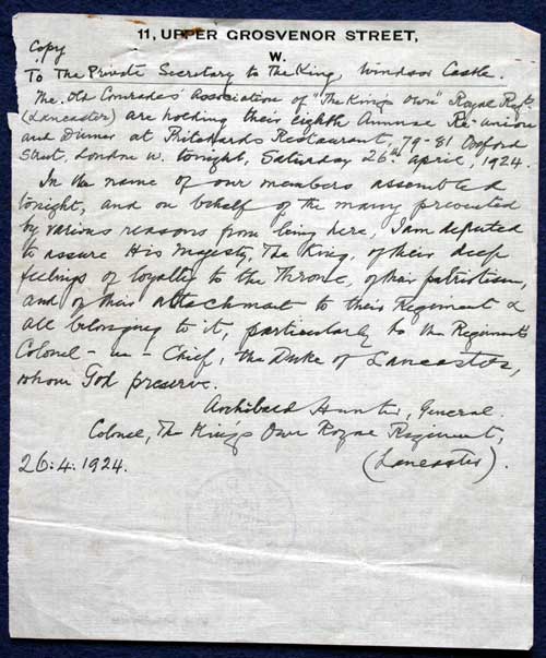Archive of General Sir Archibald Hunter GCB GCVO DSO TD LLD at the King's Own Royal Regiment Museum, Lancaster. Copy of Letter from Hunter to King re Old Comrades Dinner, 1924 Copy 11 Upper Grosvenor Street, W. To The Private Secretary to The King, Windsor Castle. The Old Comrades Association of ‘The King’s Own’ Royal Regiment (Lancaster) are holding their eighth Annual Re-Union and Dinner at Pritchard's Restaurant, 79-81 Oxford Street, London, tonight, Saturday 26th April 1924. In the name of our member assembled tonight, and on behalf of the many prevented by various reasons from being here, I am deputed to assure His Majesty, The King, of their deep feelings of loyalty to the Throne, of their patriotism and of their attachment to this Regiment and all belonging to it, particularly to the Regiment’s Colonel in Chief, The Duke of Lancaster, whom God preserve. Archibald hunter General Colonel, The King’s Own Royal Regiment (Lancaster) 26 April 1924 Accession Number: KO0680/06