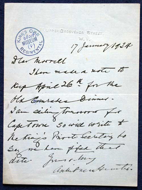 Archive of General Sir Archibald Hunter GCB GCVO DSO TD LLD at the King's Own Royal Regiment Museum, Lancaster. Letter from General Sir Archibald Hunter to Morrell re dinner on 26 Apr 1924 Letter dated 17 Jan 1924 Dear Morrell, I have made a note to keep April 26th for the Old Comrades Dinner. I am sailing tomorrow for Cape Town so will write to the King’s Private Secretary to say we have fixed the date. Yours sincerely Archibald Hunter Accession Number: KO0680/07