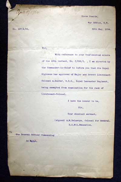 Archive of General Sir Archibald Hunter GCB GCVO DSO TD LLD at the King's Own Royal Regiment Museum, Lancaster. With the Egyptian Army Typewritten Letter from