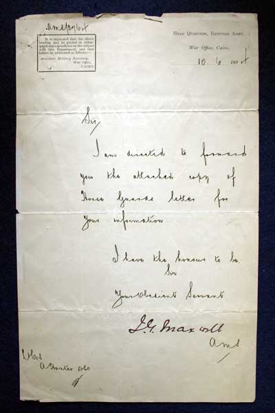 Archive of General Sir Archibald Hunter GCB GCVO DSO TD LLD at the King's Own Royal Regiment Museum, Lancaster. With the Egyptian Army Letter from Headquarters