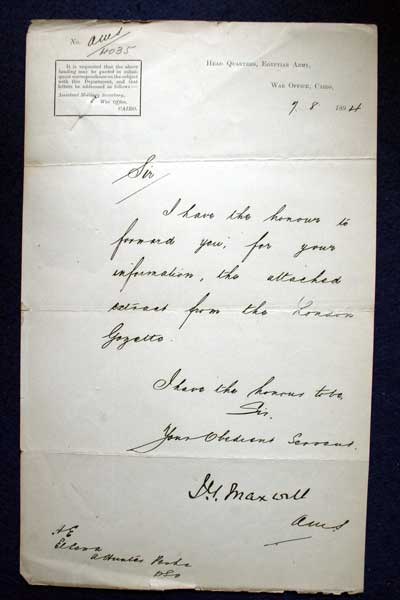 Archive of General Sir Archibald Hunter GCB GCVO DSO TD LLD at the King's Own Royal Regiment Museum, Lancaster. With the Egyptian Army Hand-written letter from