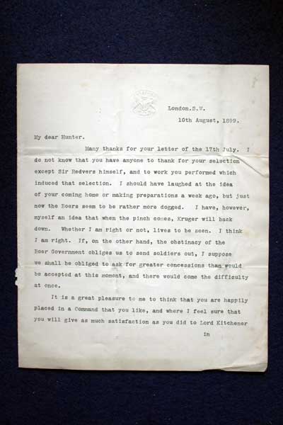 Archive of General Sir Archibald Hunter GCB GCVO DSO TD LLD at the King's Own Royal Regiment Museum, Lancaster. Evelyn Wood - Hunter Letters Typewritten letter from