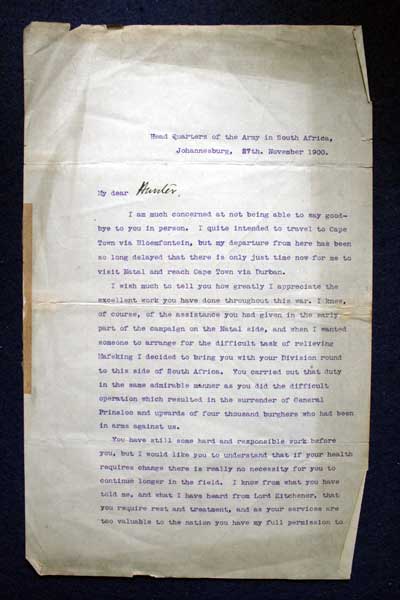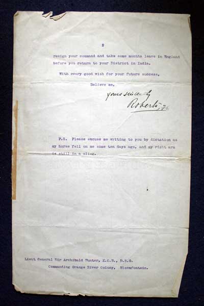 Archive of General Sir Archibald Hunter GCB GCVO DSO TD LLD at the King's Own Royal Regiment Museum, Lancaster. Hunter and South Africa Typewritten letter from Field Marshal Roberts, Headquarters of the Army in South Africa, Johannesburg, 27 Nov 1900 to Lieutenant General Sir Archibald Hunter, Commanding Orange River Colony, Bloemfontein. Accession Number: KO2686-024 & 025 |