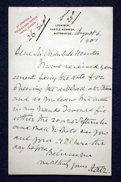 Letter dated 6 Aug 1901 from Lord Stair to Hunter regarding the opening