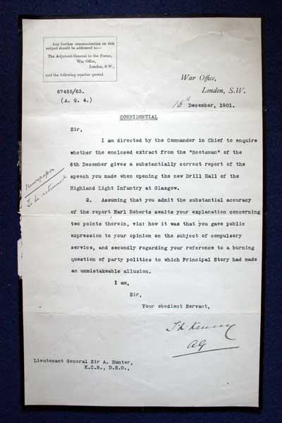 Archive of General Sir Archibald Hunter GCB GCVO DSO TD LLD at the King's Own Royal Regiment Museum, Lancaster. Hunter as General Officer Commanding, Scotland Confidential letter from the Adjutant General at the War Office to Lieutenant General Sir Archibald Hunter, dated 16 Dec 1901 concerning an extract from the ‘Scotsman’ newspaper. Accession Number: KO2686/035 |