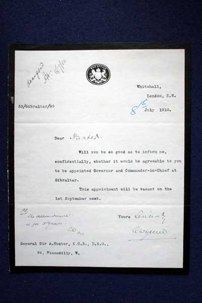 Archive of General Sir Archibald Hunter GCB GCVO DSO TD LLD at the King's Own Royal Regiment Museum, Lancaster. General Hunter appointed Governor of Gibraltar. Letter to Hunter from Lieutenant General Sir A S Wynne, KCB, Military Secretary to the Secretary of State for War, War Office, dated 8 Jul 1910 concerning Hunter’s appointment as Governor and Commander-in-Chief at Gibraltar KO2686/044 |