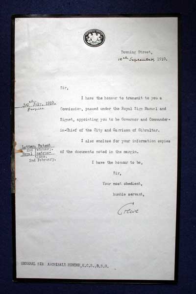 Archive of General Sir Archibald Hunter GCB GCVO DSO TD LLD at the King's Own Royal Regiment Museum, Lancaster. General Hunter appointed Governor of Gibraltar. Letter from the Colonial Office, Downing Street, from Crewe to General Sir Archibald Hunter, dated 10 Sep 1910 concerning appointment to be Governor and Commander-in-Chief of the City and Garrison of Gibraltar. KO2686/048 |