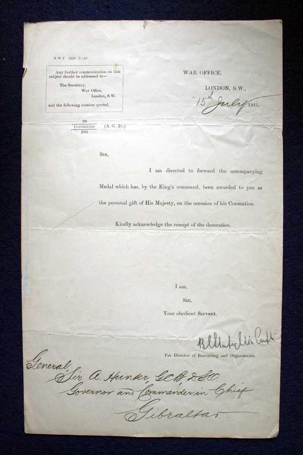 Archive of General Sir Archibald Hunter GCB GCVO DSO TD LLD at the King's Own Royal Regiment Museum, Lancaster. Honours, Awards and Medals Letter to General Sir A Hunter, Governor and Commander in Chief, Gibraltar, from the War Office, Director of Recruiting and Organisation regarding the award of the Coronation Medal, 15 Jul 1911 Accession Number: KO2686/052 |