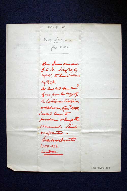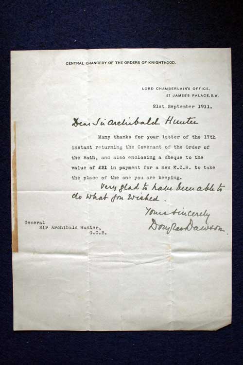 Archive of General Sir Archibald Hunter GCB GCVO DSO TD LLD at the King's Own Royal Regiment Museum, Lancaster. Honours, Awards and Medals Letter to Hunter from the Central Chancery of the Orders of Knighthood dated 21 Sep 1911 regarding Hunter’s KCB Accession Number: KO2686/055 |
