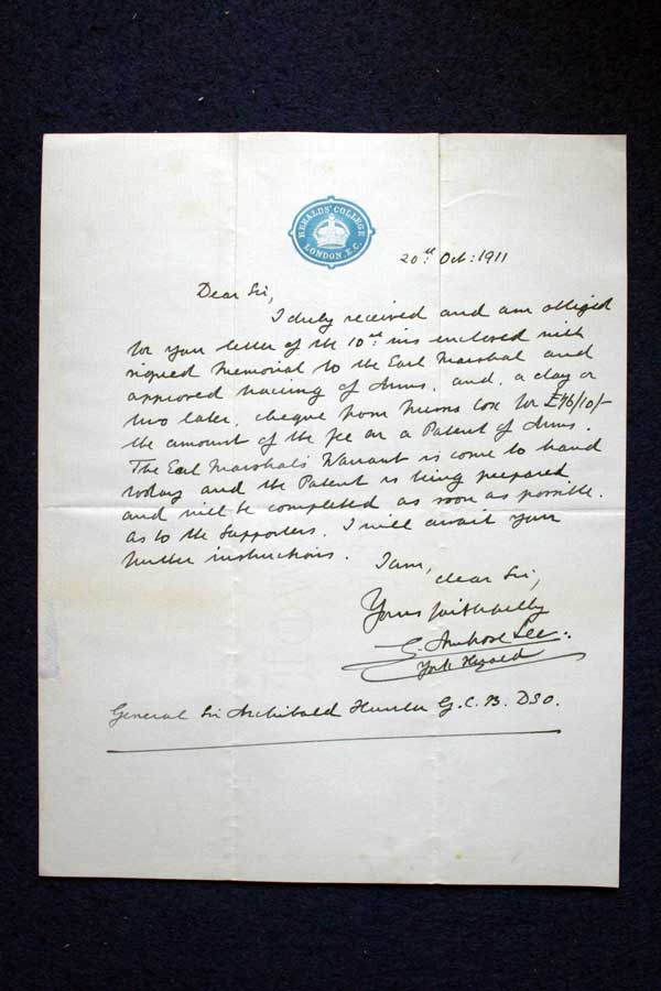 Archive of General Sir Archibald Hunter GCB GCVO DSO TD LLD at the King's Own Royal Regiment Museum, Lancaster. Honours, Awards and Medals Letter from Herald’s College, London, dated 20 Oct 1911 to General Sir Archibald Hunter Accession Number: KO2686/056 |
