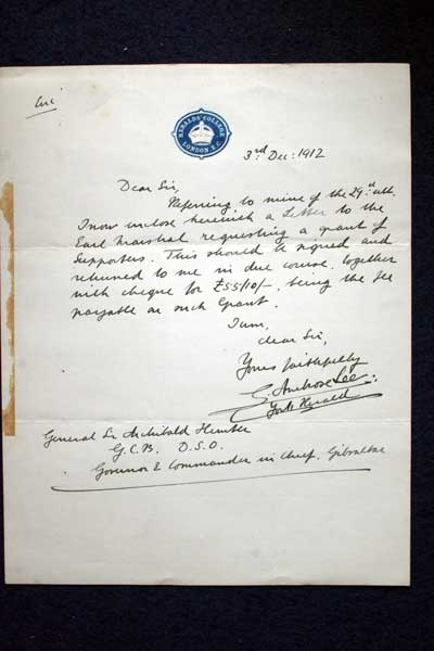 Archive of General Sir Archibald Hunter GCB GCVO DSO TD LLD at the King's Own Royal Regiment Museum, Lancaster. Honours, Awards and Medals Letter from Herald’s College, London, dated 3 Dec 1912 regarding grant of supporters. Accession Number: KO2686/059 |