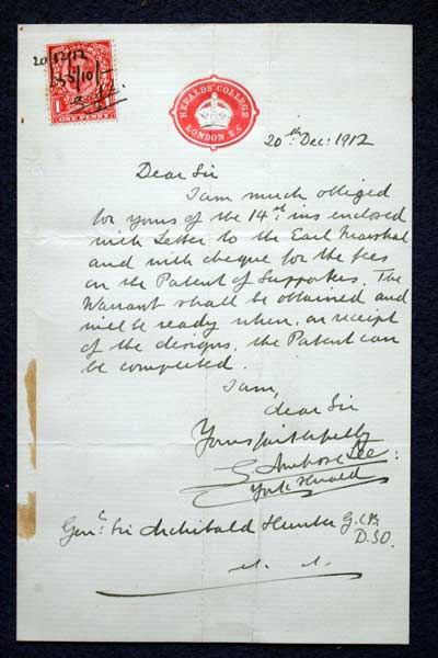 Archive of General Sir Archibald Hunter GCB GCVO DSO TD LLD at the King's Own Royal Regiment Museum, Lancaster. Honours, Awards and Medals Letter from Herald’s College, London, dated 20 Dec 1912 regarding receipt of cheque for the Patent of Supporters. Accession Number: KO2686/060 |