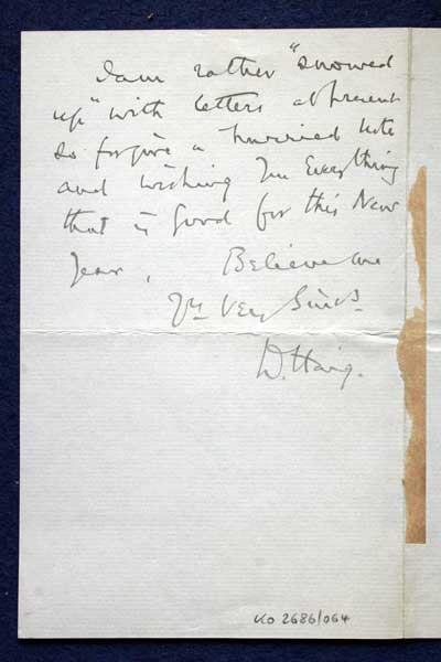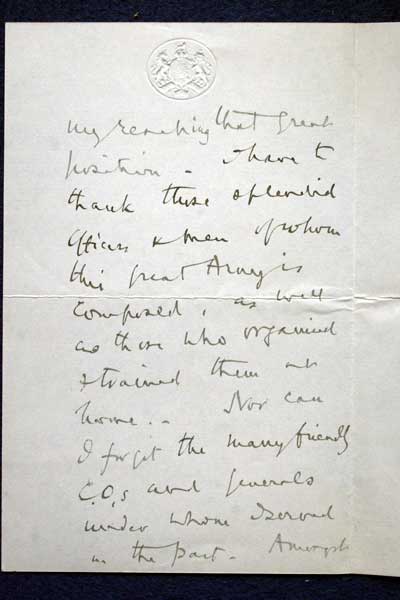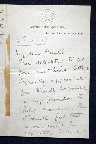 Archive of General Sir Archibald Hunter GCB GCVO DSO TD LLD at the King's Own Royal Regiment Museum, Lancaster. Letter to Hunter dated 4 Jan 1917 from Field Marshal Douglas Haig regarding his recent promotion to Field Marshal KO2686/064 |