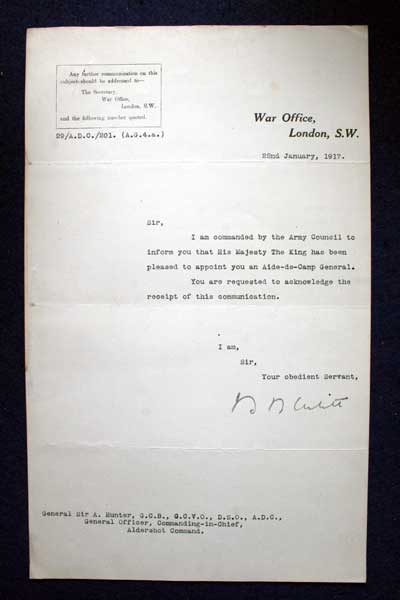Archive of General Sir Archibald Hunter GCB GCVO DSO TD LLD at the King's Own Royal Regiment Museum, Lancaster. Aides de Camp to HM King Letter to Hunter from the