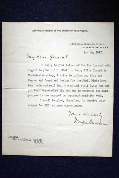 May 1917 from Lord Chamberlain’s Office regarding a Stall in Henry VII’s