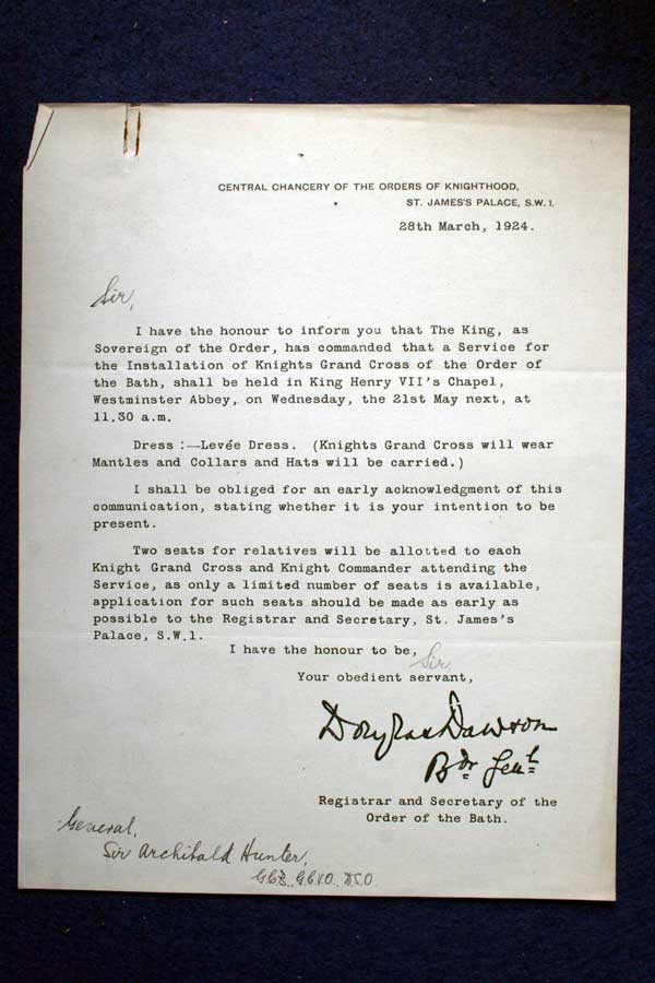 Archive of General Sir Archibald Hunter GCB GCVO DSO TD LLD at the King's Own Royal Regiment Museum, Lancaster. Honours, Awards and Medals Letter to Hunter from
