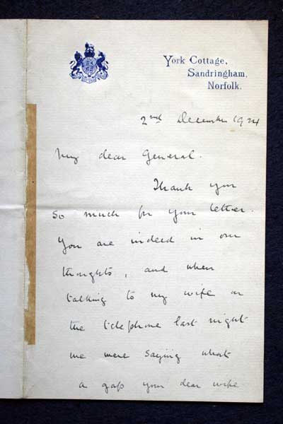 Archive of General Sir Archibald Hunter GCB GCVO DSO TD LLD at the King's Own Royal Regiment Museum, Lancaster. Royal Household Correspondence Letter to Hunter from Clive Wigram, York Cottage, Sandringham, Norfolk dated 2 Dec 1924. Accession Number: KO2686/086 |