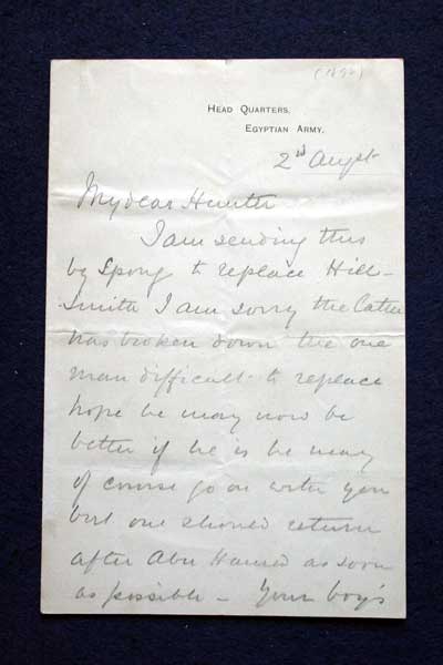Archive of General Sir Archibald Hunter GCB GCVO DSO TD LLD at the King's Own Royal Regiment Museum, Lancaster. Letter to Hunter from Kitchener, dated 2nd August 1897 “Headquarters, Egyptian Army 2nd Aug 1897 KO2686/088