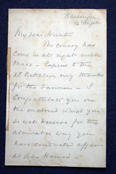 Archive of General Sir Archibald Hunter GCB GCVO DSO TD LLD at the King's Own Royal Regiment Museum, Lancaster. Letter to Hunter from Kitchener, dated 14th August 1897 KO2686/091