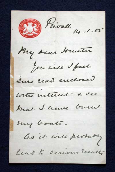 Archive of General Sir Archibald Hunter GCB GCVO DSO TD LLD at the King's Own Royal Regiment Museum, Lancaster. Letter to Hunter from Kitchener, dated 14 Jan 1905 KO2686/106 |