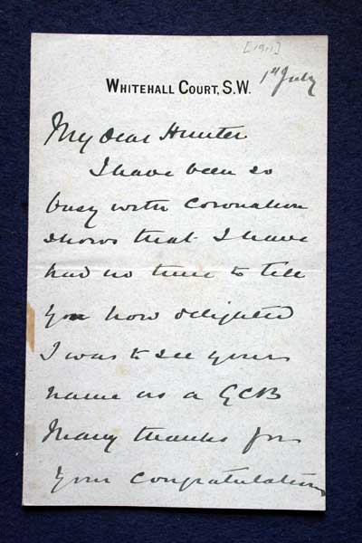 Archive of General Sir Archibald Hunter GCB GCVO DSO TD LLD at the King's Own Royal Regiment Museum, Lancaster. Letter to Hunter from Kitchener, dated 1 Jul 1911 KO2686/113 |
