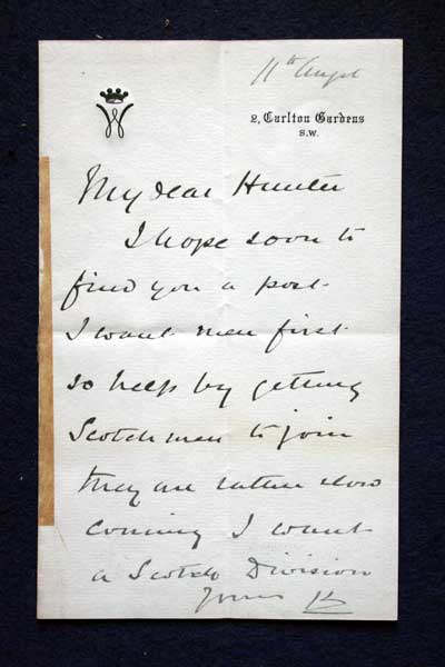 Archive of General Sir Archibald Hunter GCB GCVO DSO TD LLD at the King's Own Royal Regiment Museum, Lancaster. Letter to Hunter from Kitchener, dated 11 Aug 1914, from 2 Carlton Gardens, SW.