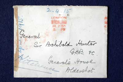 Archive of General Sir Archibald Hunter GCB GCVO DSO TD LLD at the King's Own Royal Regiment Museum, Lancaster. Envelope Envelope addressed to General Sir Archibald Hunter,