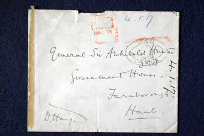 Archive of General Sir Archibald Hunter GCB GCVO DSO TD LLD at the King's Own Royal Regiment Museum, Lancaster. Envelope Envelope addressed to General Hunter, Government House,