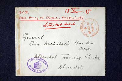 Archive of General Sir Archibald Hunter GCB GCVO DSO TD LLD at the King's Own Royal Regiment Museum, Lancaster. Envelope Envelope addressed to General Hunter, Aldershot Training
