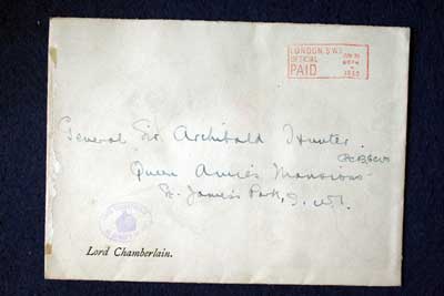 Archive of General Sir Archibald Hunter GCB GCVO DSO TD LLD at the King's Own Royal Regiment Museum, Lancaster. Envelope Envelope addressed to General Sir Archibald Hunter,