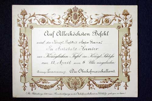 Archive of General Sir Archibald Hunter GCB GCVO DSO TD LLD at the King's Own Royal Regiment Museum, Lancaster. Invitation 13 Apr 1901 “Auf Allerhőchsten Befehl nrid der Kőnigl Gropbrit Major General Sir Archibald Hunter zur Kőniglichen Tafel in Kőnigl Schlofse am 13 April um 6 Uhr eingeladen. Anzug: Paradeanaug. Das Oberhofmarschallamt.” “On a sovereign command [ ] The Royal Great British Major General Sir Archibald Hunter for royal table in Kőnigl. [Locksmith] on April 13 invited by 6 clock. Suit: [Paradeanaug]. The Lord Marshal Office” Accession Number: KO2686/186