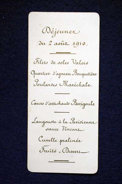Archive of General Sir Archibald Hunter GCB GCVO DSO TD LLD at the King's Own Royal Regiment Museum, Lancaster. Menu for Dinner 2 Aug 1910, Brussels. Accession Number: KO2686/190