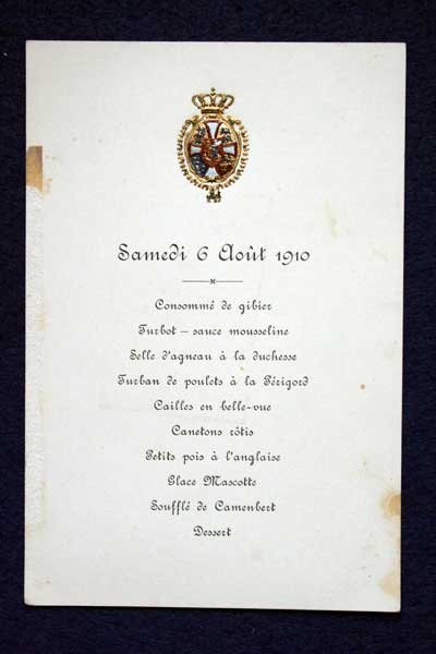 Archive of General Sir Archibald Hunter GCB GCVO DSO TD LLD at the King's Own Royal Regiment Museum, Lancaster. Menu for dinner 6 Aug 1910 Accession Number: KO2686/193