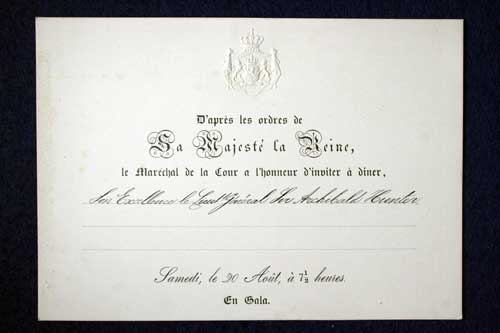 Archive of General Sir Archibald Hunter GCB GCVO DSO TD LLD at the King's Own Royal Regiment Museum, Lancaster. Invitation to Dinner 20 Aug 1910. The Hague Accession Number: KO2686/203