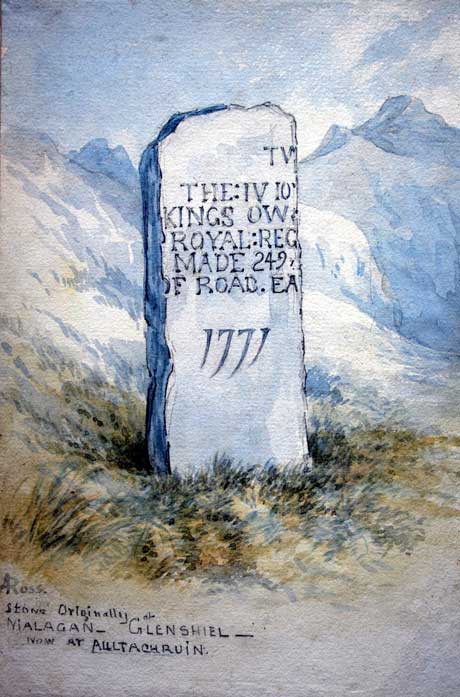 Notes on Regimental Stations on old Highland Roads, written in the 1920s. The stone shown on the sketch by Alexander Ross, LL.D., was originally place on the line of Road from Fort Augustus to Glenshiel in Kintail - a few miles East of the present hotel at the head of Loch Duich and was intended to mark the portions of the Road made by the different Regiments. This practice was usual in other parts of the Highlands when the Military were employed in making roads and Dr. Johnston mentions in his journey through Glenmoriston in 1773 that he passed parties of soldiers engaged on these roads. The old Military Road on which this and other stones were found, is now disused except by pedestrians - it leads from Fort Augustus directly over the Hill into Glenmoriston. The modern Road branches off from Loch Ness at the Moirston Bridge, and runs directly up the Valley of the Moriston all the way to Glenshiel, and generally on the North side of the old Road, which latter keeps the higher ground. The Stone marked XXX Regiment is still in situ and is 1.5 miles East of the Hotel above referred to. The Stone set up by the King's Own Royal Regiment originally stood a Malagan a few miles further up the Glen and being a handsome Stone, it was carried off by a Kintail Crofter about 50 years ago to form a Lintel in his house in a village called Aultachruin where it still remains. Being however now out of the building and used as a stand for wash-tubs. Sometime ago, at the writer's suggestion an attempt was made to get it replace in its original position (which is quite well known) but since, attention has been drawn to it a number of archaeologists and others have visited and inspected it, and so given the women (who now occupies the house) such an exaggerated idea of its value that she refuses to part with it, except at a high price, and consequently nothing has been done. The stone has been chipped to fit the Cotter's requirements and so part of the inscription has disappeared. There is, however, enough remaining to identify it.