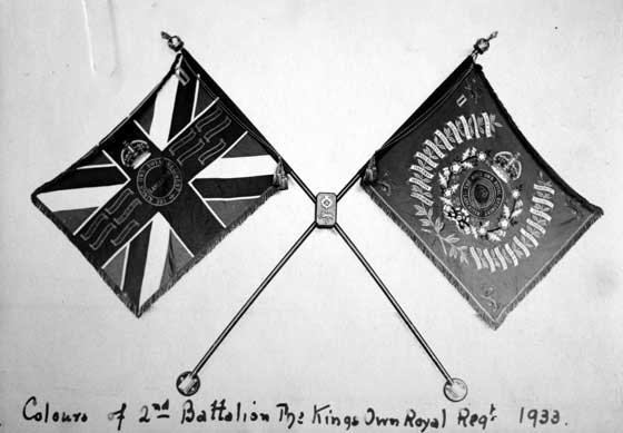 2nd Battalion, King’s Own. Presented by Field Marshal Sir Claude Jacob GCB GCSI KCMG at Rawalpindi, India, on 27th January 1926. Retained by the 1st Battalion when the 2nd amalgamated with it on 22nd April 1949. Laid up in the King’s Chapel, Gibraltar, on 18th December 1955.