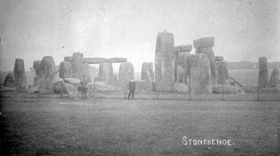 Stonehenge, Salisbury Plain, end of 1907 Manoeuvres. Bill Whitehead with cycle, awaiting the arrival of the