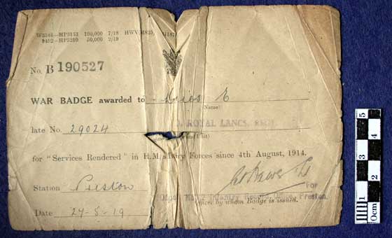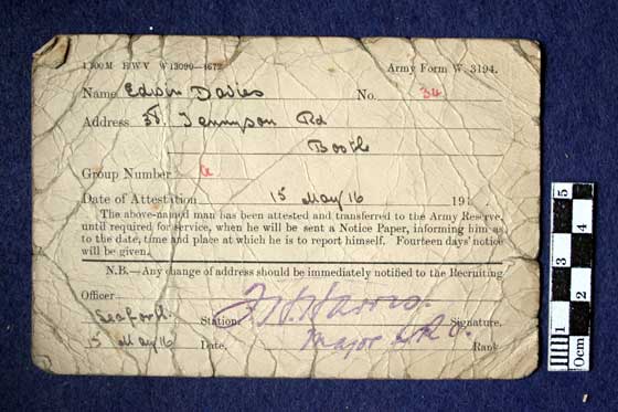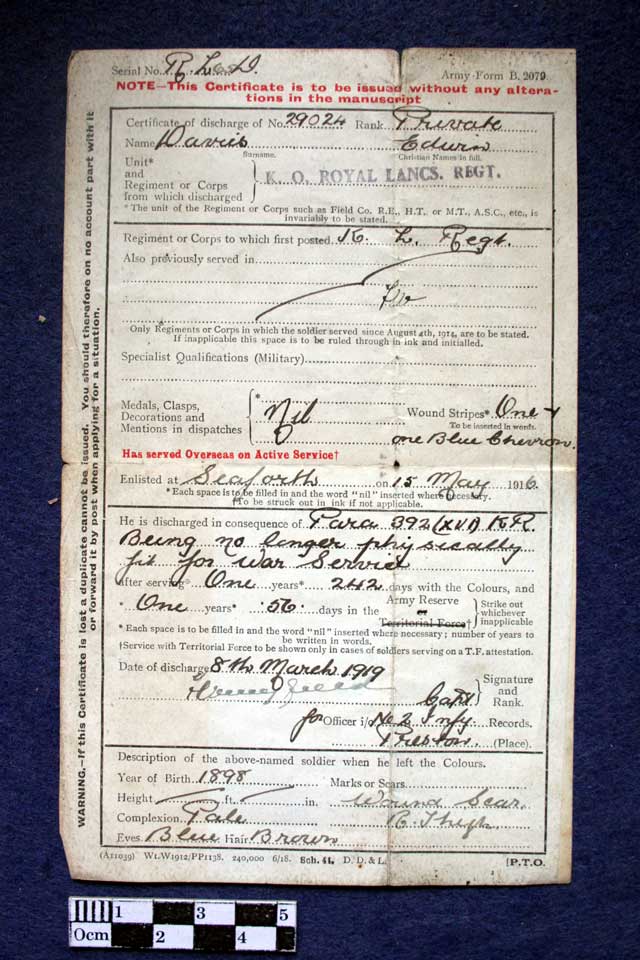 Soldiers of the Regiment Private Edwin Davies Private Edwin Davies, number 29024, 8th Battalion, King's Own Royal Lancaster Regiment.