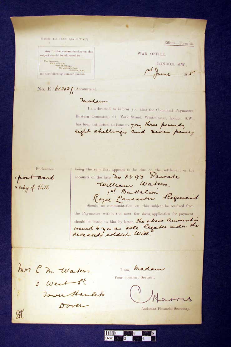 Standard Letter re effects of Private William Waters, 1 Jun 1915