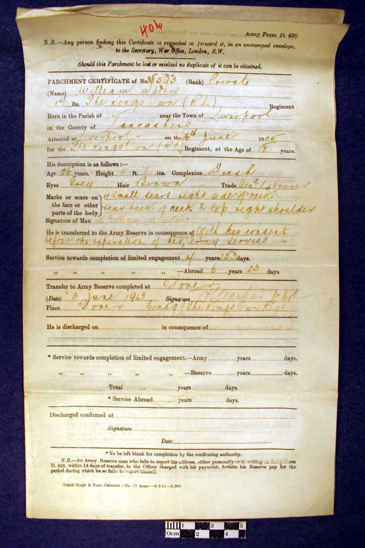 Army Form D 426 Parchment Certificate of Private William Waters, number
