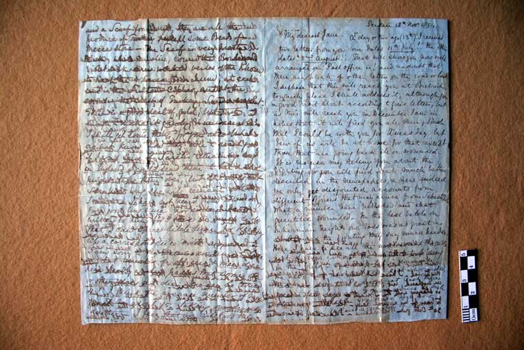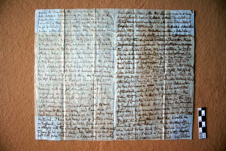 Refers to casualties on Inkerman heights and the base hospital; the arrival of nurses and nuns from England and a Miss Nightingale. The Duke of Cambridge is also mentioned. Of personal matters, he describes a scarf which he has sent to ‘Carry’ (Miss Begbie) and hopes his sister will write to her and try to like her! (a daguerreotype, it seems, has been unfavourably received).