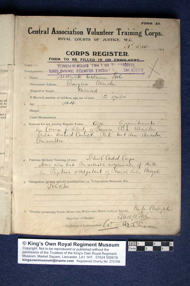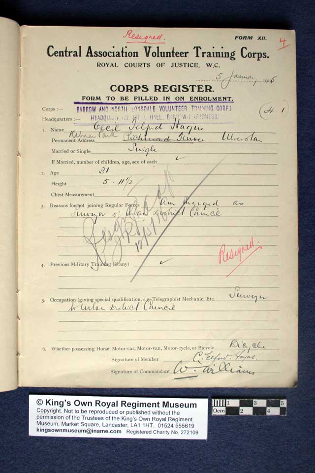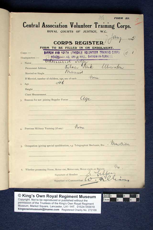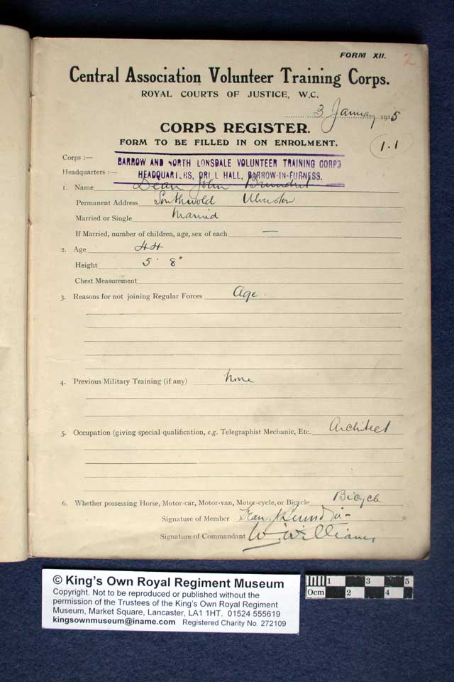 Collections - First World War - Volunteer Battalions Register of members of the Barrow and North Lonsdale Volunteer Training Corps Pages 1 to 5